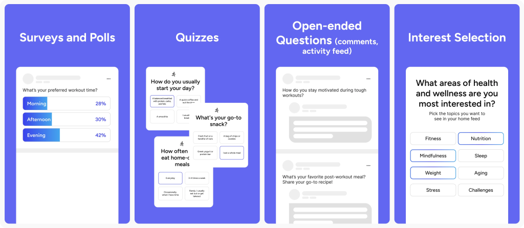 Common methods include surveys, polls, quizzes, onboarding forms, and open-ended questions in comments or activity feeds. Choose methods that feel natural and align with the value offered to users.
